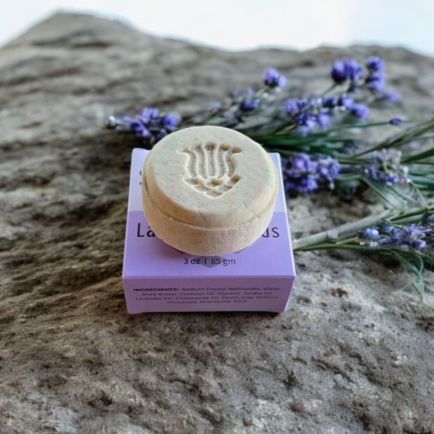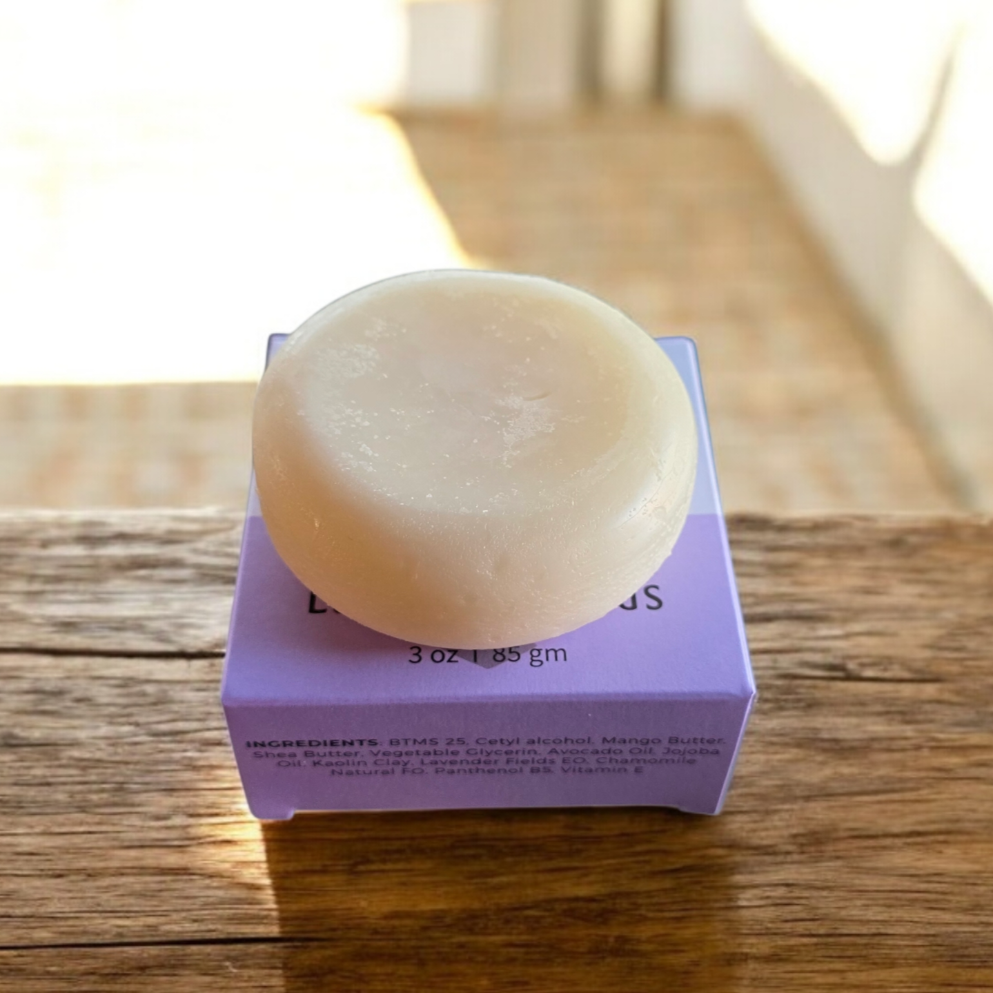 Conditioner Bar Ingredients: BTMS 25, Cetyl Alcohol, Mango Butter, Shea Butter, Vegetable Glycerin, Avocado Oil, Jojoba Oil, Kaolin Clay, Lavender Fields Essential Oil, Chamomile Natural Fragrance Oil, Panthenol B5, and Vitamin E.